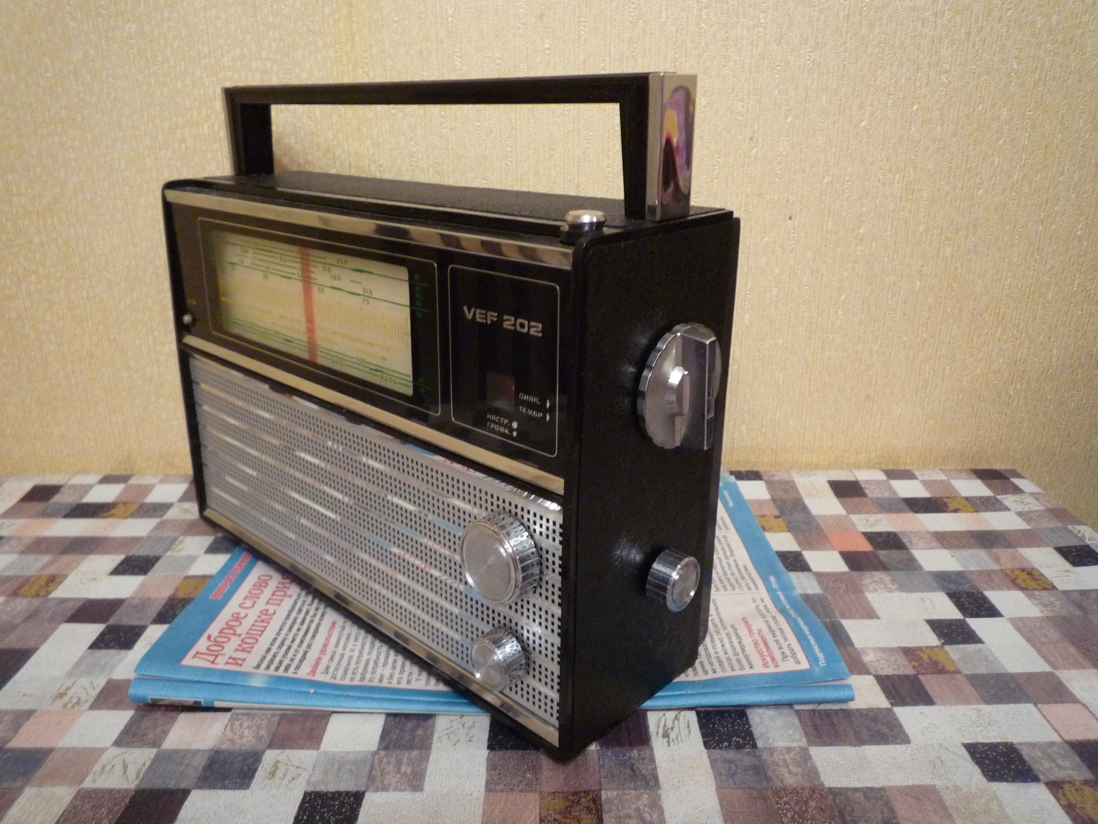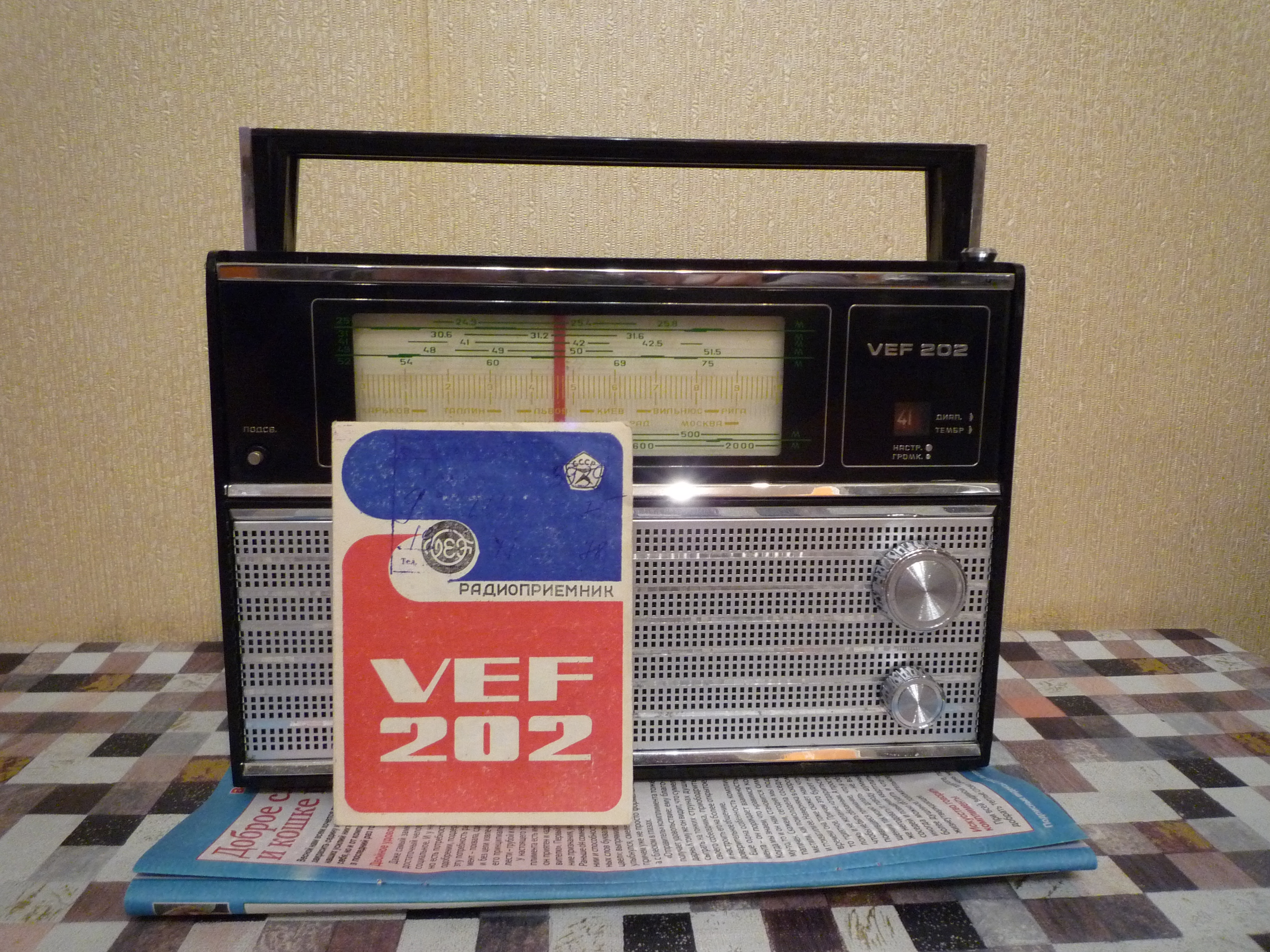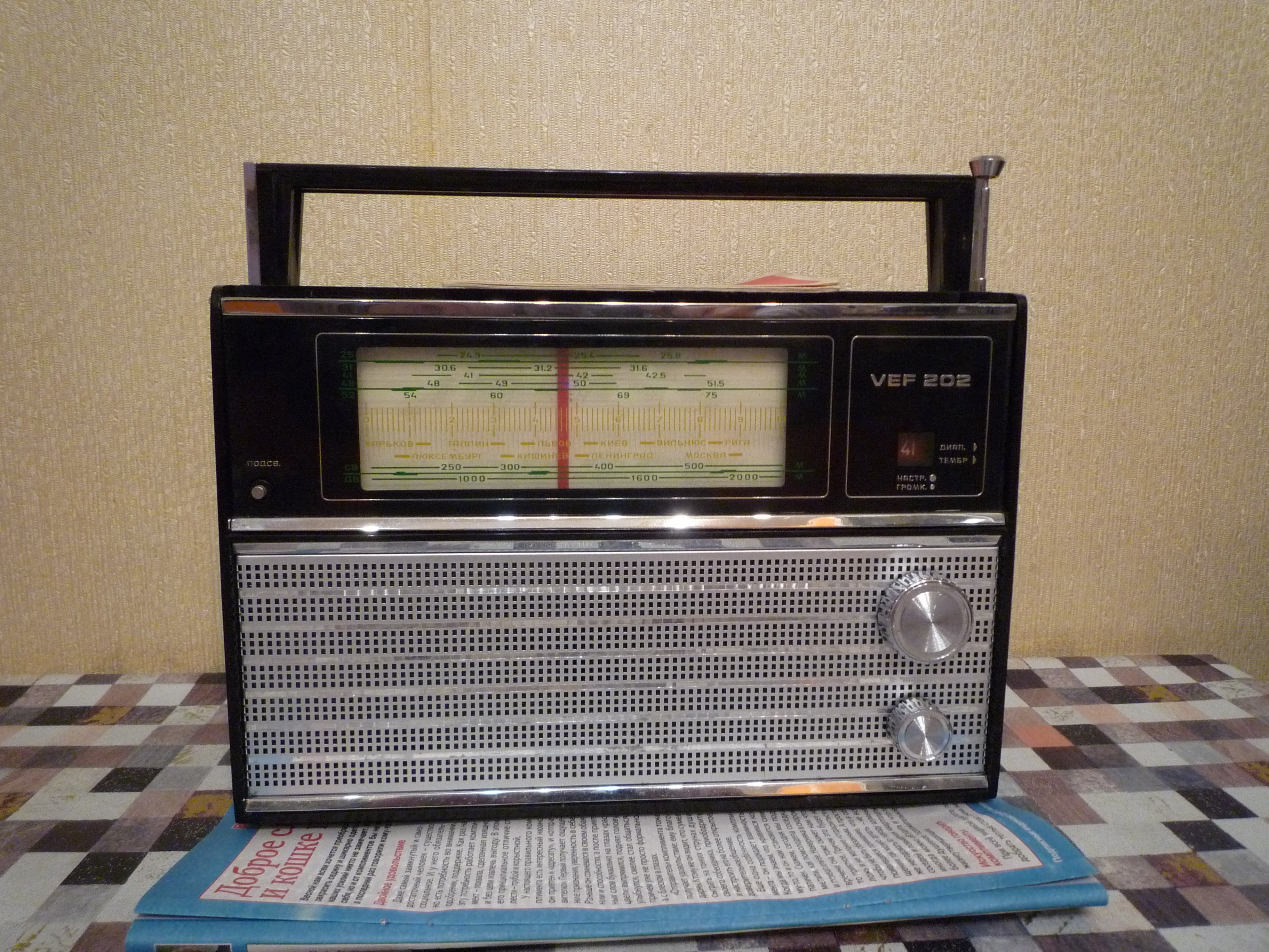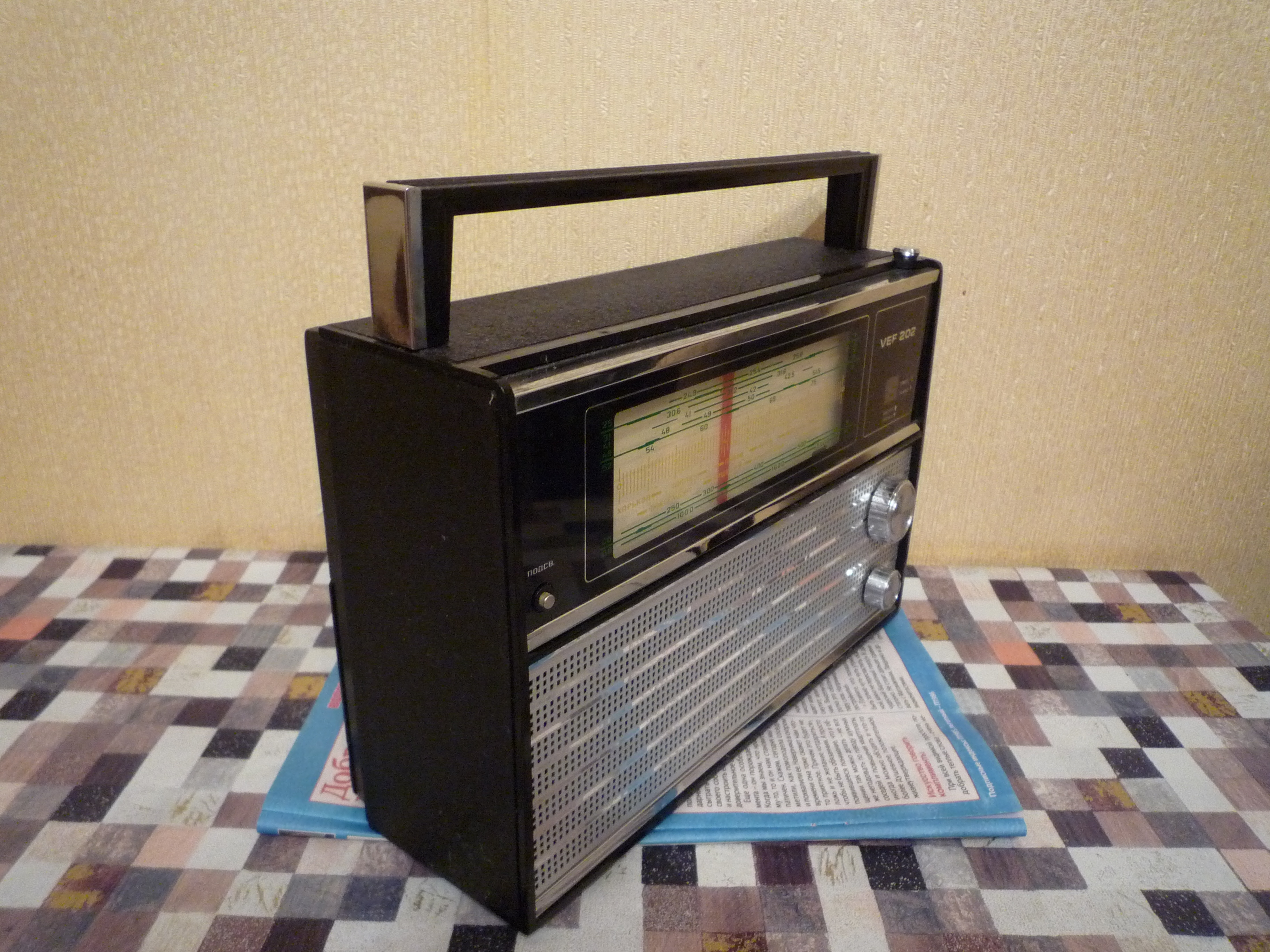 Продаётся радиоприёмник ВЭФ-202,год выпуска 1975. Приёмник изготовлен на Рижском заводе, очень хорошо сохранился для своих лет,был обнаружен при ремонте в квартире на дальней полке. Корпус целый,антеннка целая,батарейный отсек в хорошем состоянии,так же нашёлся паспорт со схемой.Шкала без глубоких царапин и трещин,звук и тембр хорошо регулируются. При подаче напряжения-приёмник начинает работать,в ночное время хорошо прослушиваются китайскии и другии радиостанции.Подсветка работает. Цена-950 руб.,перешлю ТК-Энергия,для знающих людей можно Авито,5Post,Яндексом.Пересыл на покупателе.