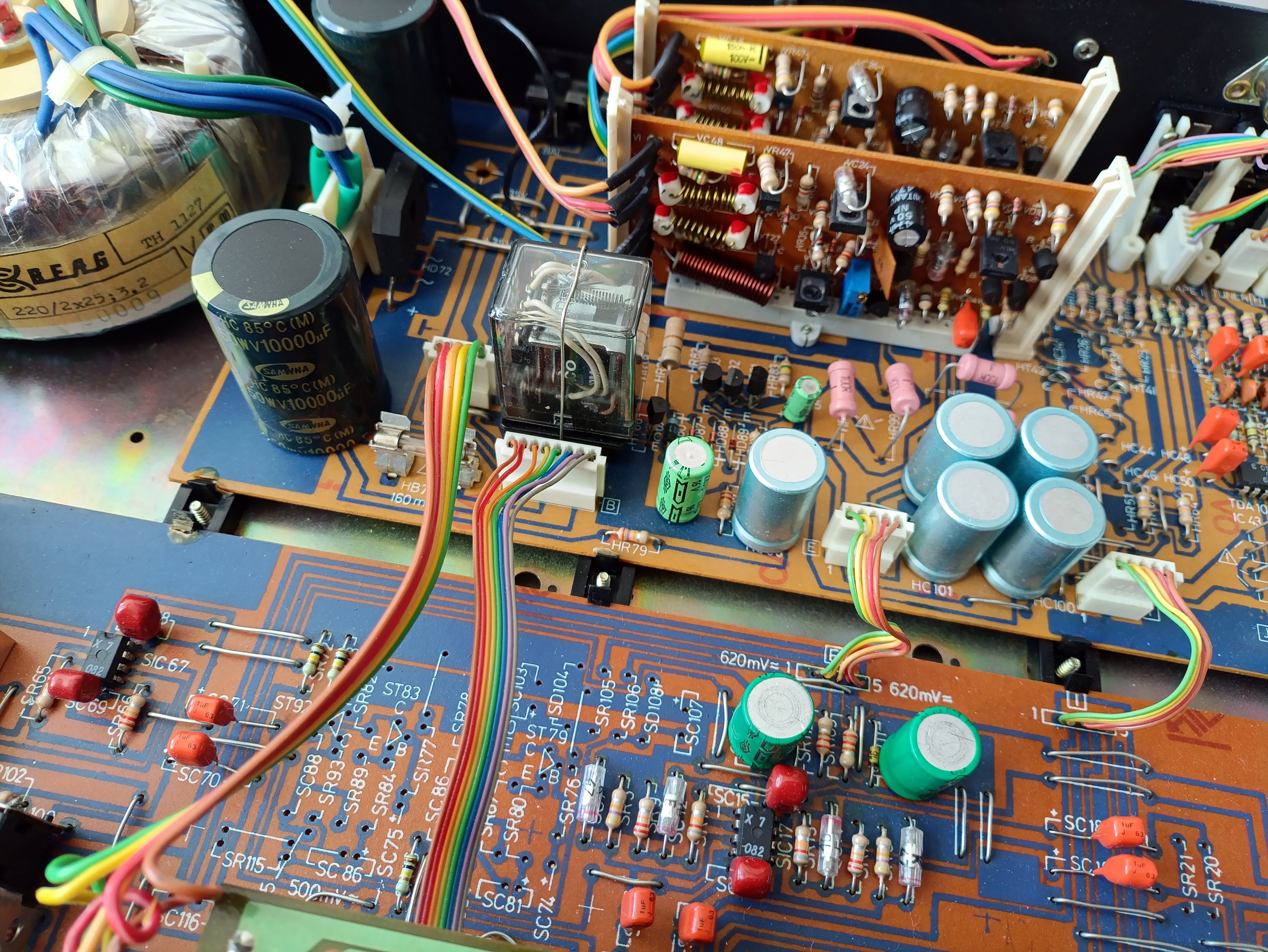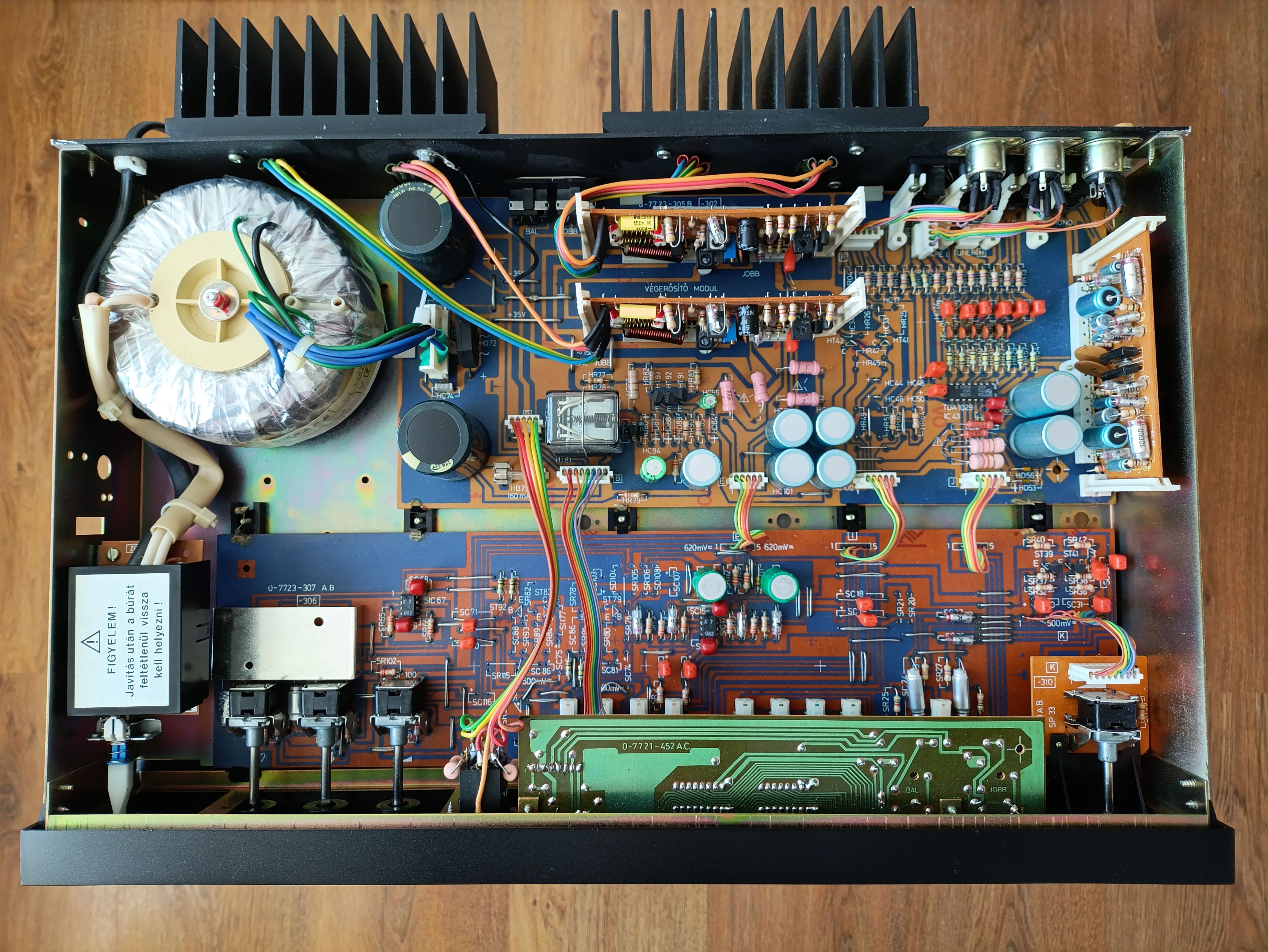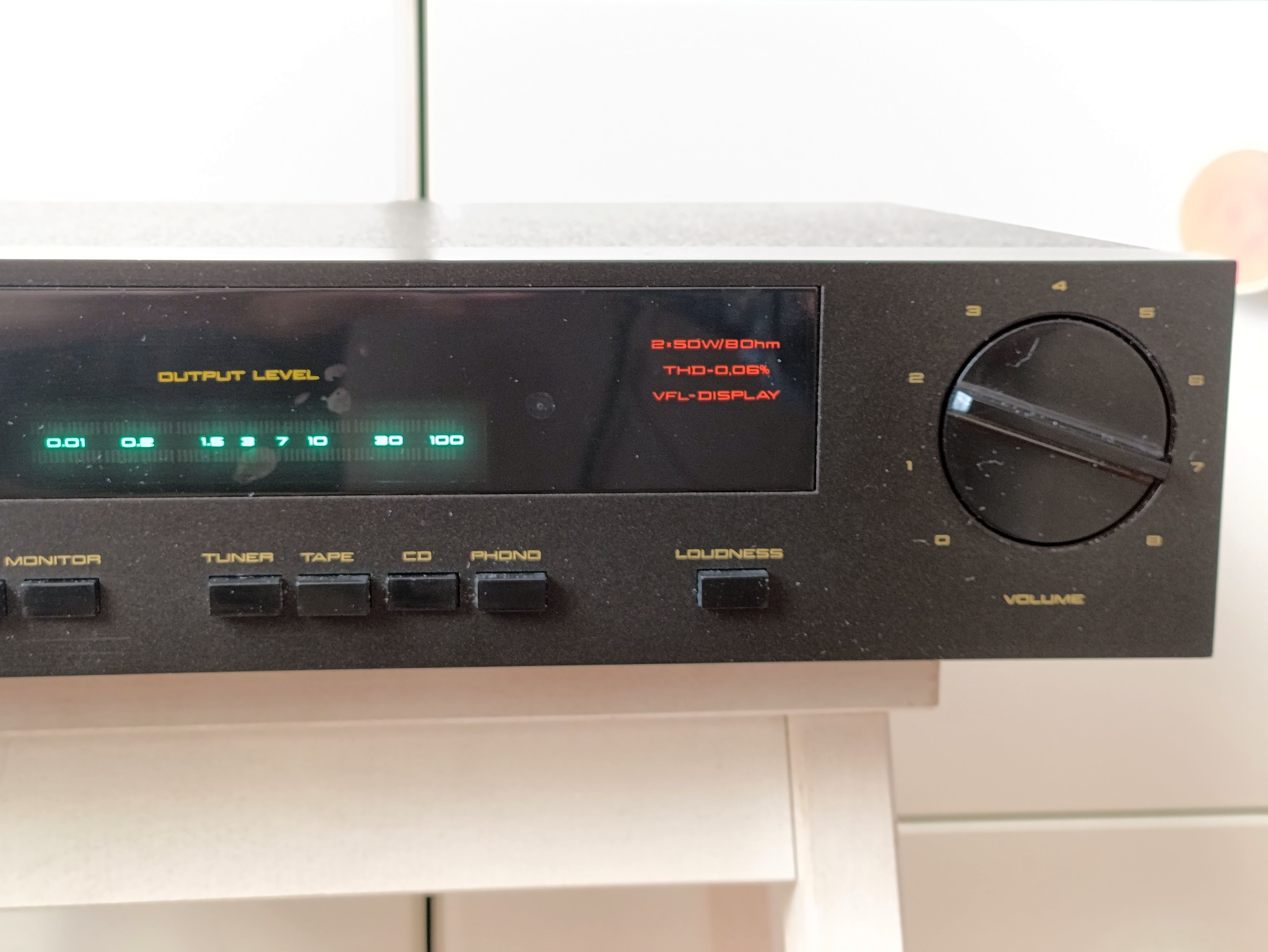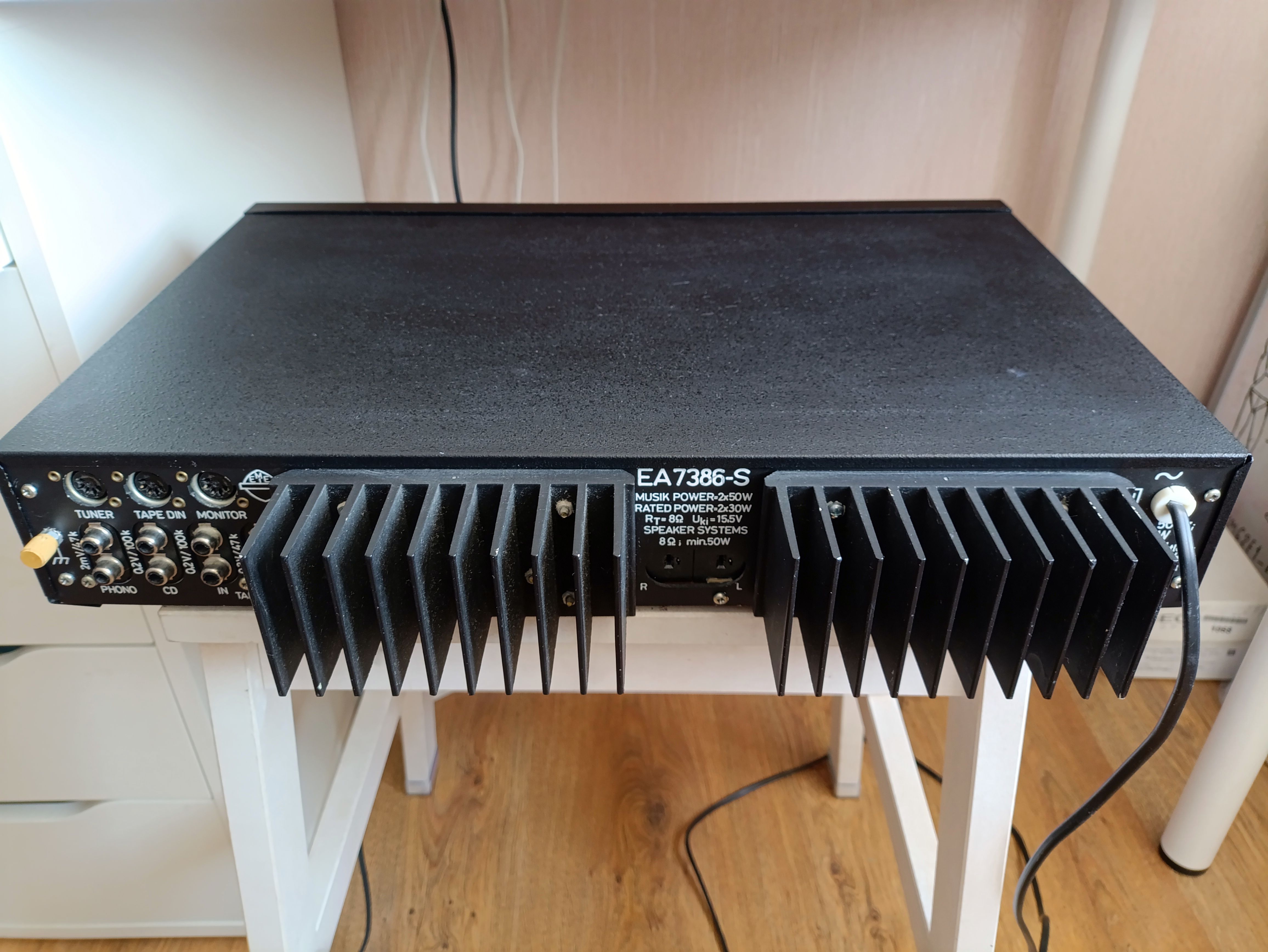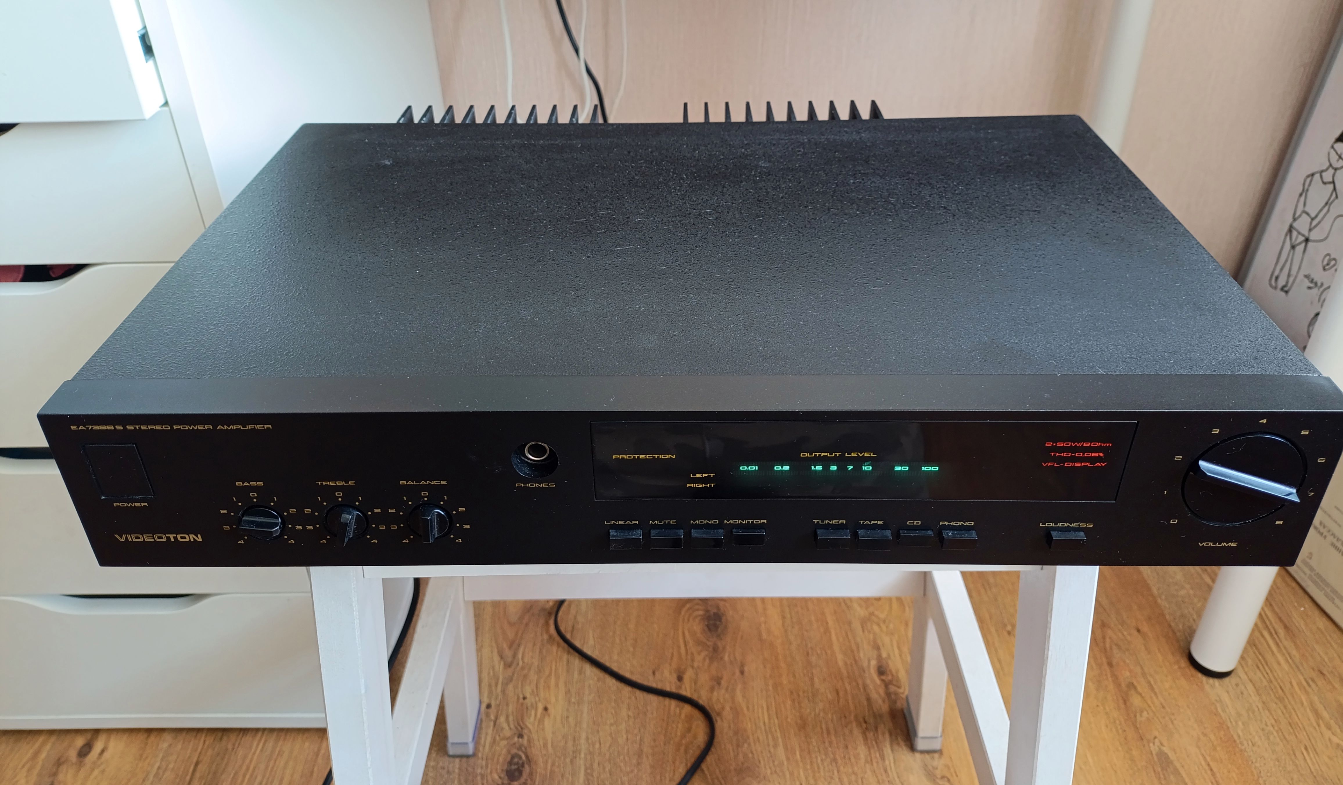 Усилитель Videoton EA7686-S. Полностью исправен. Нагрузка 4-16Ом. Мощность 2*50Вт(8Ом). Диапазон частот 15Гц-40КГц.КНИ 0,06%. Чувствительность 500мВ, фонокорректор 5мВ.Входные разьемы RCA и DIN5. На входе электронный коммутатор. Есть вход Monitor, сигнал идет на предварительный усилитель сразу, минуя коммтатор. Темброблок отключаемый. Флуоресцентный индикатор выходной мощности. По внешнему виду на 5- из 5. На верхней крышке в одной точке отбита краска. На пластике индикатора несколько пятен, особых усилий отчистить не прилагал, моющим средством не отмылись. Все переменные резисторы и переключатели были разобраны, очищены и смазаны. Конденсаторы фильтра питания заменил на Samwha 10000мкф, в оригинале было 4700. Параллельно электролитам фильтров установлены пленочные. Также заменен диодный мост выпрямителя на больший ток. Электролиты по звуку были убраны и заменены на пленочные. В УМ заменены подстроечники на многооборотные и перевыставлен ток покоя. Оплата на карту Сбера или ВТБ. Хорошо запакую. Отправлю почтой, постамат 5пост, Озон. Цена 10000р.