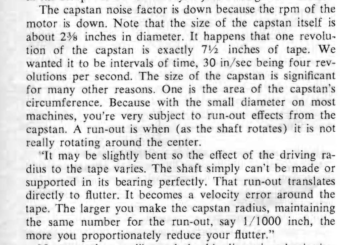 но у Метаксоса видно что он не инженер а рисовальщик. При свободном обхвате капстана важно сцепление - так что поверхность должна быть и не грубая, но и не гладкая, для сцепления ленты без повреждения. Иначе стабильного проигрывания не будет. на металле надо делат прорези для выхода слоя возздуха (как на VHS drum). А у него - гладкий вал и по виду сталь. Поэтому он насобачил роликов натяжения на капстан до и после. Но так как лента скользит - то смысла в том капстане?