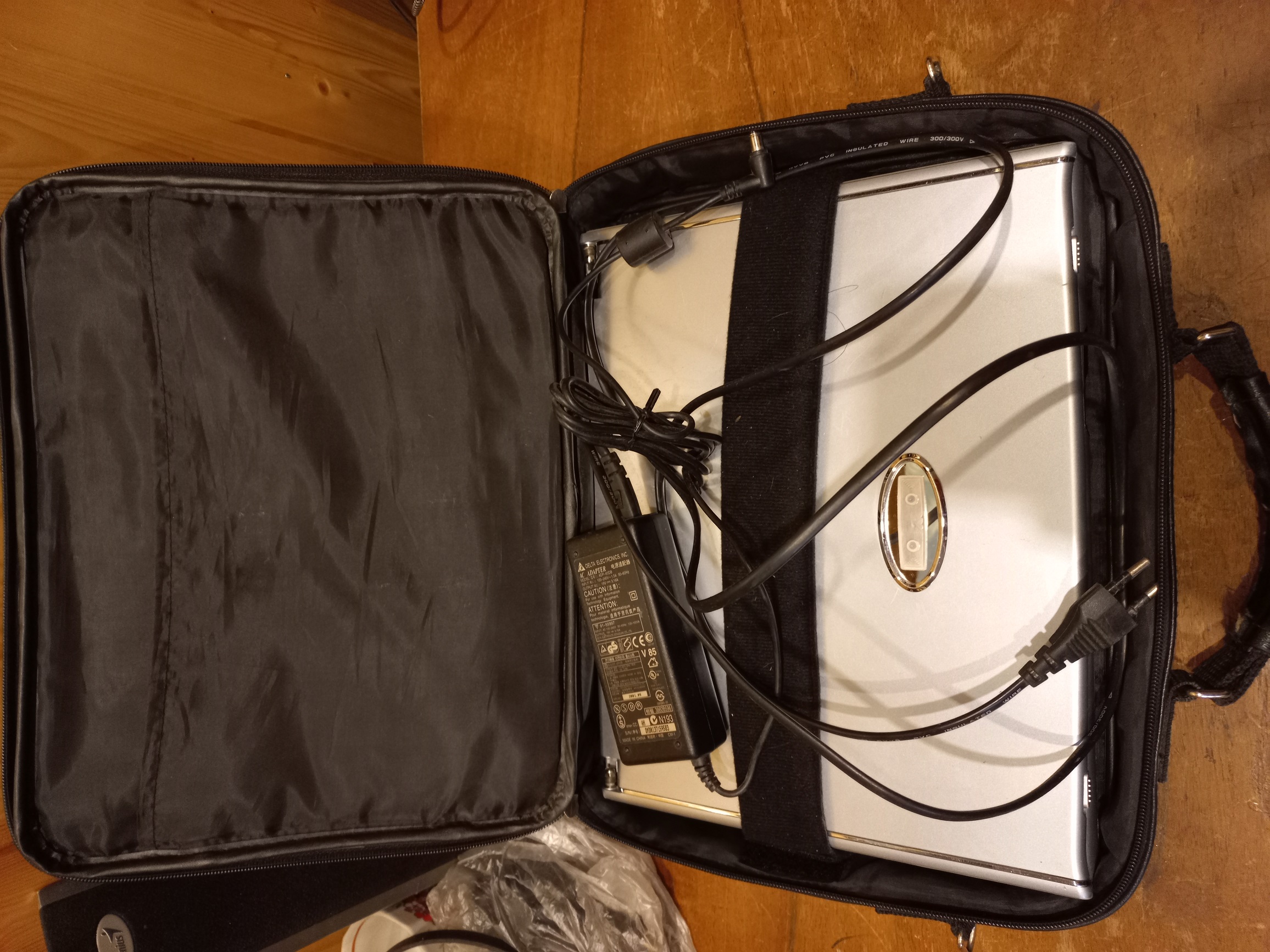 В комплекте блок питания и родной кожаный портфель для этого ноутбука.
